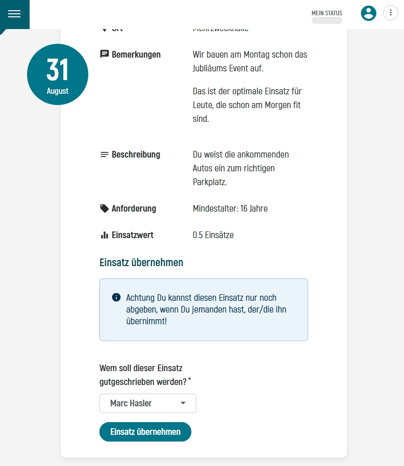 Die erste Option ist, Helfenden zu erlauben, von Hand einzutragen, von wem der Einsatz geleistet wird. Dieses Szenario macht Sinn, wenn Kinder Vereinsmitglieder sind, selber noch keine Einsätze leisten können/dürfen, die Eltern aber nicht als Helfende registriert werden sollen. So kann eingetragen werden, wer beim Einsatz erscheint, der Einsatz wird aber derjenigen Person gutgeschrieben, welche im Portal eingeloggt ist.