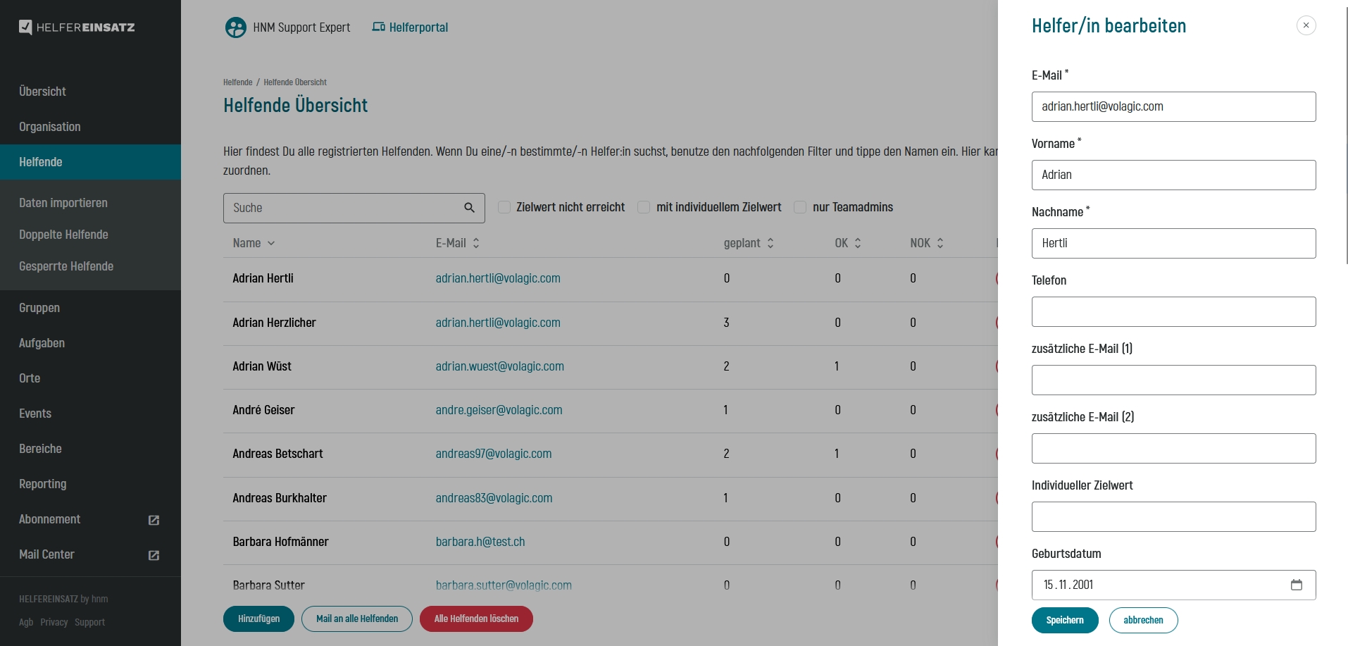 Helfendendaten können, analog der Detailansicht, auch direkt in der Übersicht bearbeitet werden.