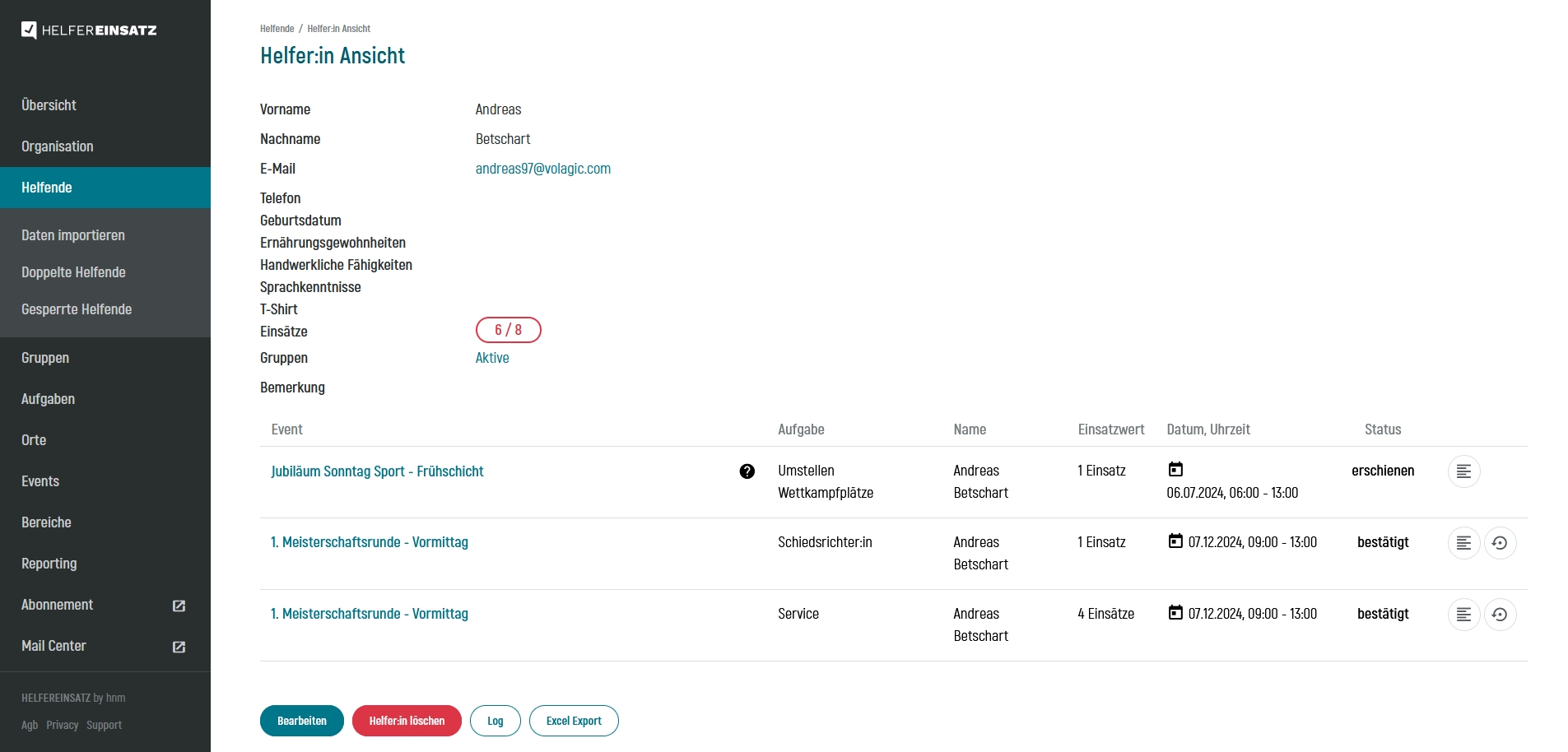 • Log: Das "Logbuch" der/des Helfers/Helferin. Hier werden sämtliche Einsätze angezeigt, also auch ob sie von den Helfenden selbst oder von Administratoren zugeteilt wurden.
