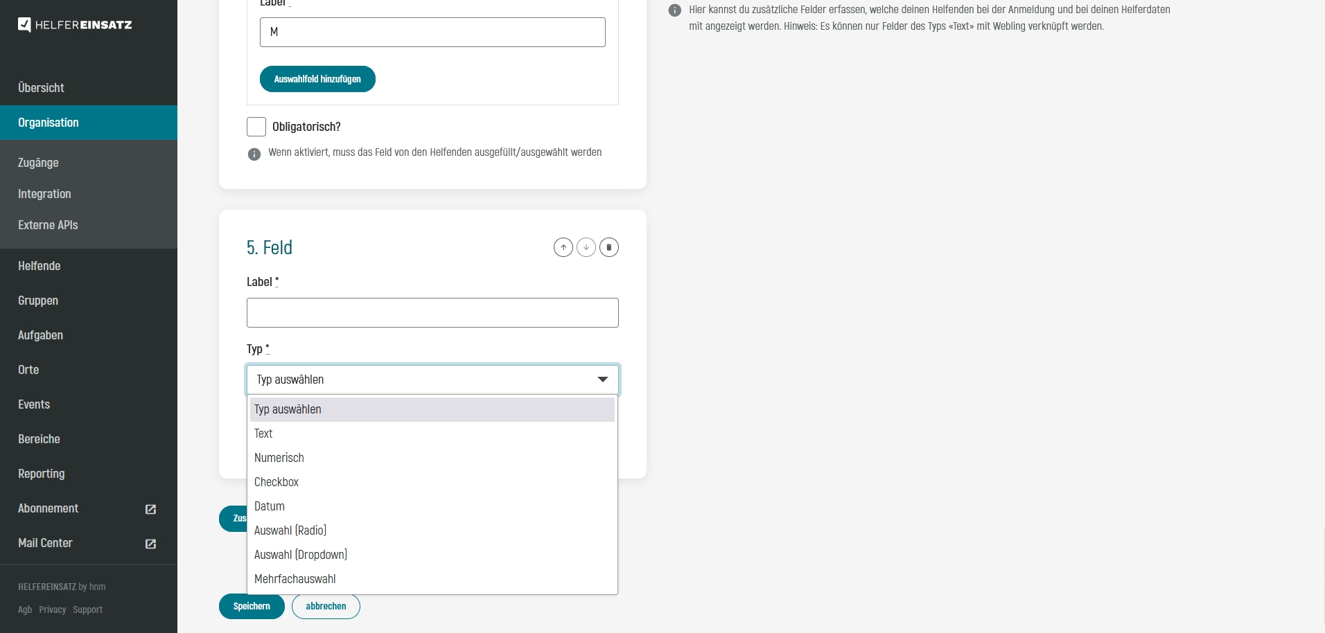 Dazu können unter "Organisation" - "Helferdaten" zusätzliche Felder für Helfende erstellt werden. Zur Auswahl stehen: