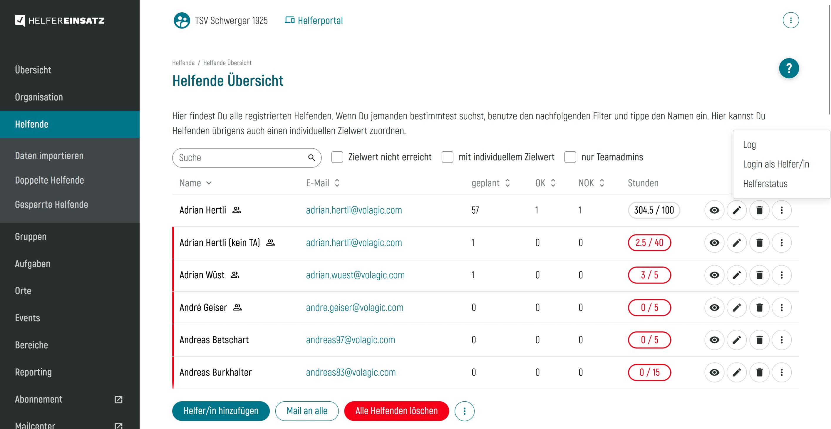 In der Übersicht können ausserdem noch direkt neue Helfende hinzugefügt, alle Helfenden gelöscht (ACHTUNG! Diese Aktion kann nicht rückgängig gemacht werden) oder alle Helfenden direkt via Mailcenter aus dem Tool kontaktiert werden (ab dem Pro-Abo).