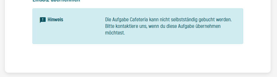 Wenn die Checkbox deaktiviert ist, bleibt die Aufgabe im Helferportal ersichtlich. Helfende können sie aber nicht direkt übernehmen. Es erscheint die Meldung, dass diese Aufgabe nicht selbstständig gebucht werden kann, und sie sich bei euch melden sollen, wenn sie die Aufgabe übernehmen wollen.
