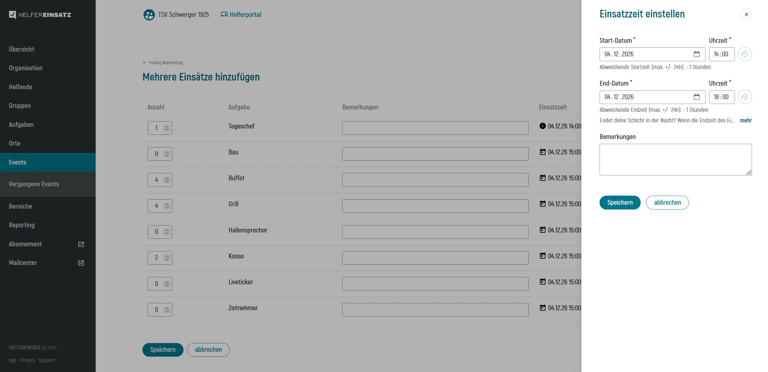 Wenn ihr eine Schicht hinzufügt, werdet ihr automatisch auf die Aufgabenmaske weitergeleitet, in welcher ihr definieren könnt, wie viele Einsätze je Aufgabe in dieser Schicht benötigt werden. Wenn ihr nun eine Aufgabe innerhalb der Schicht habt, die abweichende Zeiten hat, könnt ihr das gleich in dieser Maske defnieren.