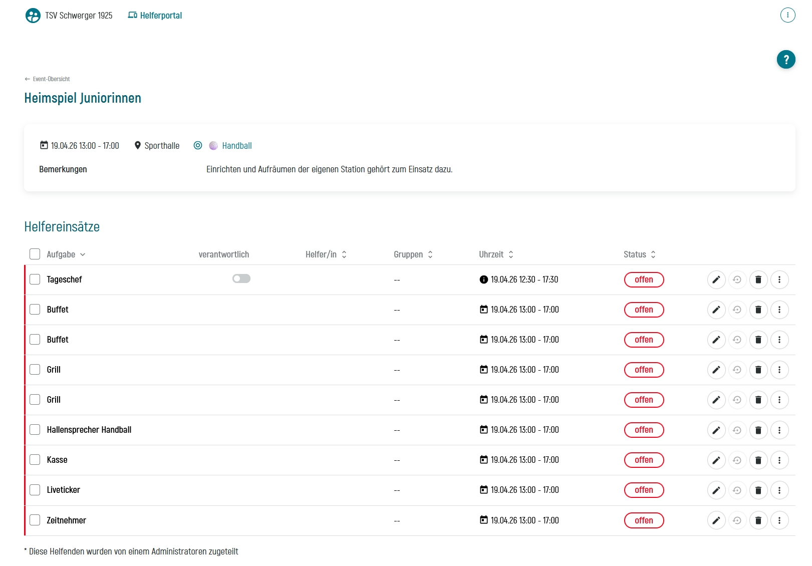 Innerhalb eines Events kann es unterschiedliche Zeitslots geben, an welchen Helfende gesucht werden. Typisches Beispiel sind hier Frühschicht, Mittagsschicht, Spätschicht usw. Um die Helfenden also in den einzelnen Zeitslots einzuplanen, könnt ihr im Event beliebig viele Schichten erstellen. In diesen Schichten wiederum plant ihr dann die Einsätze ein.
