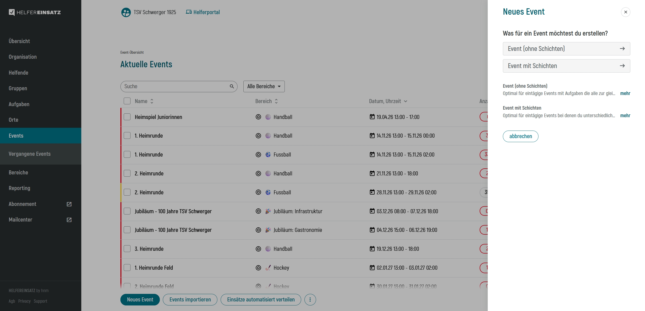Es gibt zwei Arten von Events in Helfereinsatz. Je nach Art eurer Veranstaltung macht die eine oder andere Art Sinn. Damit ihr bereits von Anfang an richtig in die Eventerstellung startet, stellen wir euch hier die beiden Arten kurz vor.