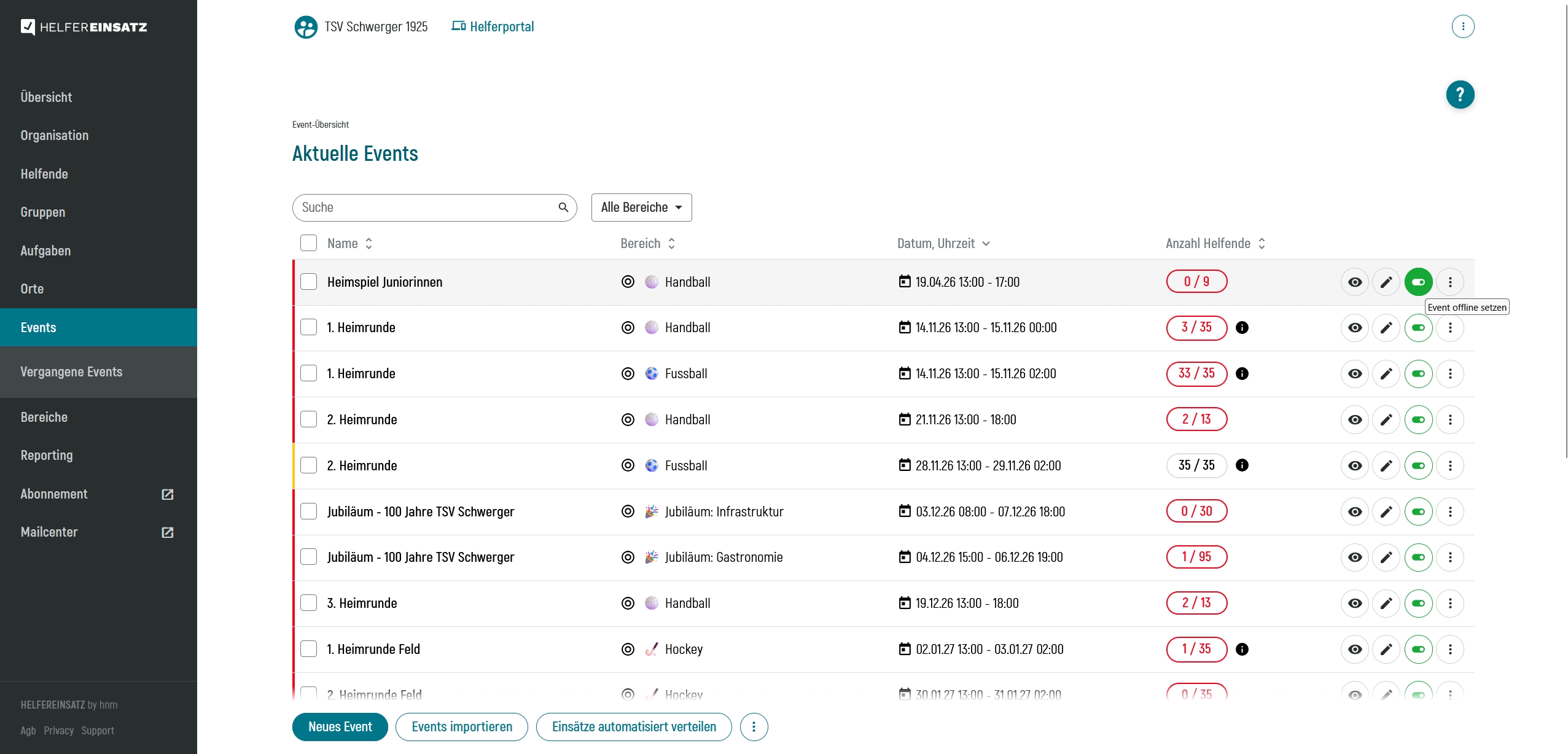 Wenn ihr euch bei der Eventerstellung noch die Möglichkeit geben wollt, das ganze nochmals in Ruhe zu prüfen, ohne dass Helfende sich bereits eintragen können, könnt ihr Events jederzeit offline stellen. Die Events können weiterhin beliebig bearbeitet werden, aber sie werden im Portal nicht angezeigt.