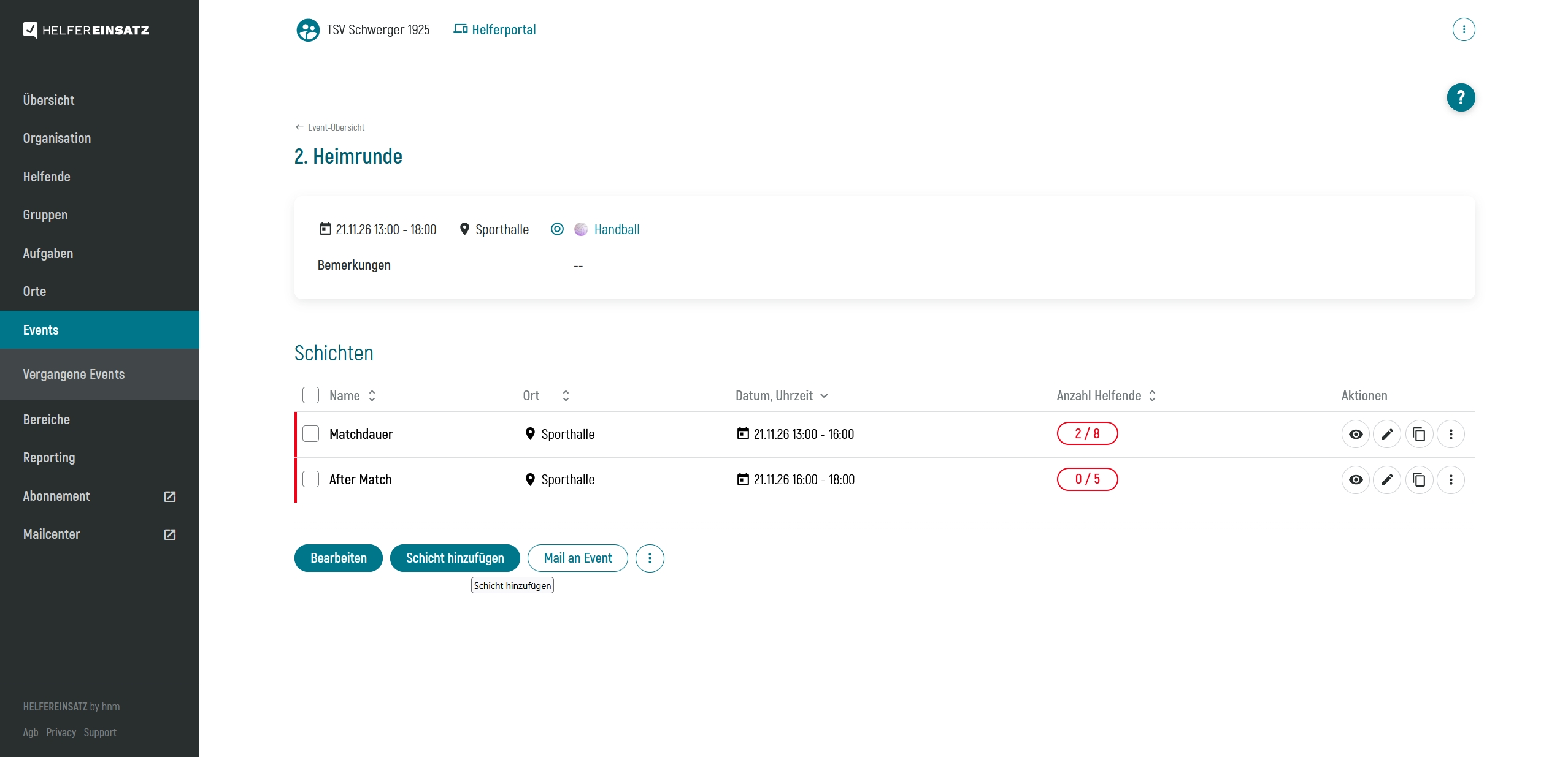 Hier sehen wir einen Event mit zwei Schichten. Um eine zusätzliche Schicht hinzuzufügen, kann der Button "Schicht hinzufügen" betätigt werden. Ihr werdet automatisch wieder durchgeleitet und könnt auch gleich alle Einsätze in dieser Schicht angeben.